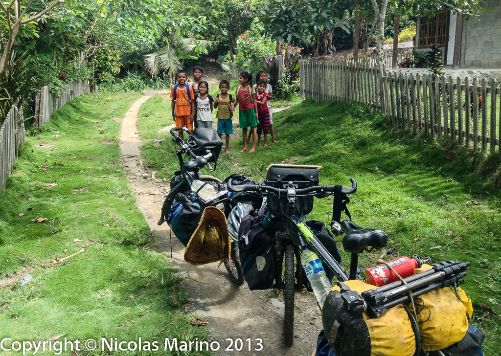 Now, the jungle had swallowed us, and we had to find the way out. Eventually, some villagers would pass with their motorcycles, but they were counted with the fingers of half a hand. We were totally alone, the sounds of the jungle with who knows how many millions of bugs and insects, invaded our senses sweetening our ride. We moved along with trouble but with the fascination and the embezzlement of two children in a world of unimaginable fantasies, feeling the elixir of adrenaline gushing from the guts, flowing through our veins. At times, the trail went up and down smoothly and it was a pleasure to cycle on it, but once we reached the climbs, the steep slopes began and we had to get off and push, sliding on the mud in a space so reduced that only the bike fit, and we would have to find a solid piece of ground on which to step on in order to be able to exert some pressure and be able to push the bike forward while trying not to fall into the steep ravines, dense in branches, shrubs and vines. We had to constantly sort out the thick trunks of fallen trees along the trail, tightly filtering through the minute gaps that were left between the trunk and the wall of the mountain. Not even an hour had passed since we had left the last village, Tuare, that the jungle had already begun to carve its memories on our legs and arms by scratching and cutting the skin open.